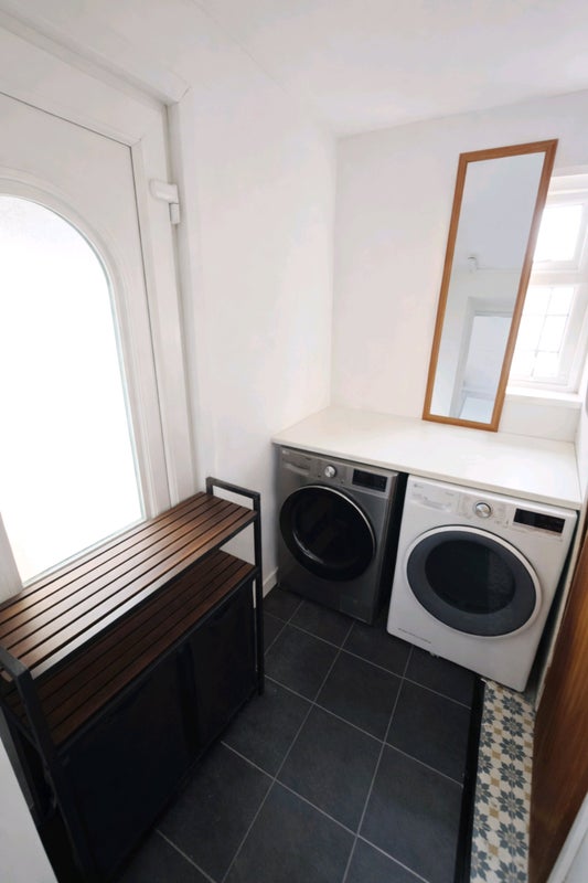 A beautifully spacious and fully equipped 1-bedroom flat with separate laundry area, perfect for a professional single or couple with ample space to work from home. Small outdoor seating area.