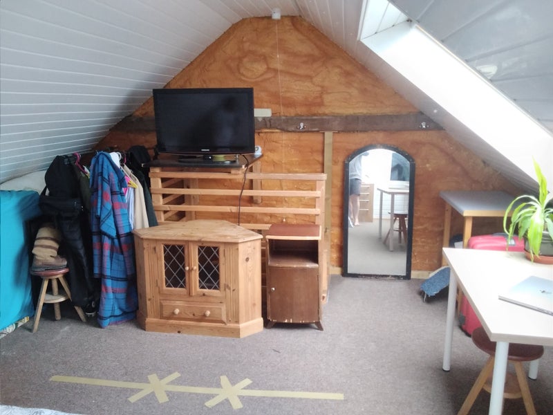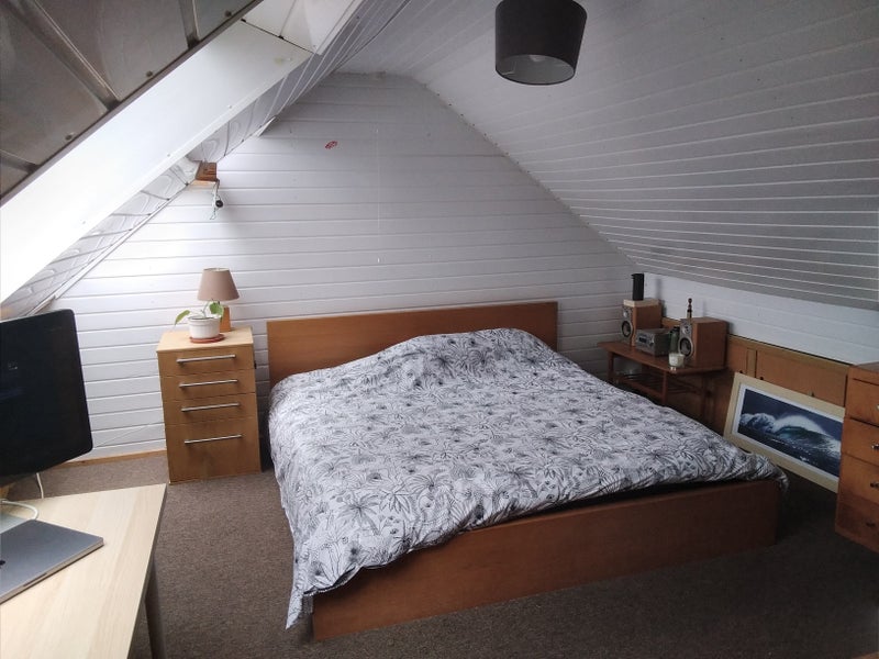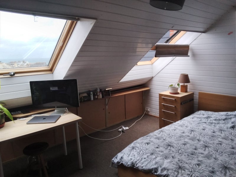 Bright spacious loft with sea views in quiet, orderly home. Very central with deck and garden in secure yard. Well equipped kitchen with fridge freezer. Shared bathroom with additional loo and a washing machine. Super views from bright, large loft with super king sized bed, lots of storage and space to chill. Not looking for party animals nor those planning to entertain friends but rather lodgers who appreciate a laid back, peaceful and private existence in a secure environment.