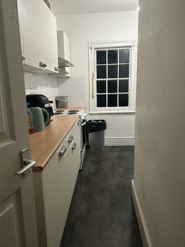 Largest room in the flat- king size bed, desk/ table that is extendable, chest of drawers and wardrobe as well as two sash windows that are south facing onto the highstreet. Always warm as within the bills package electricity is included.