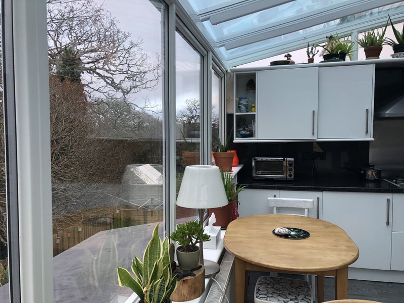The kitchen living space is half a conservatory, with the woodland and wildlife surroundings.