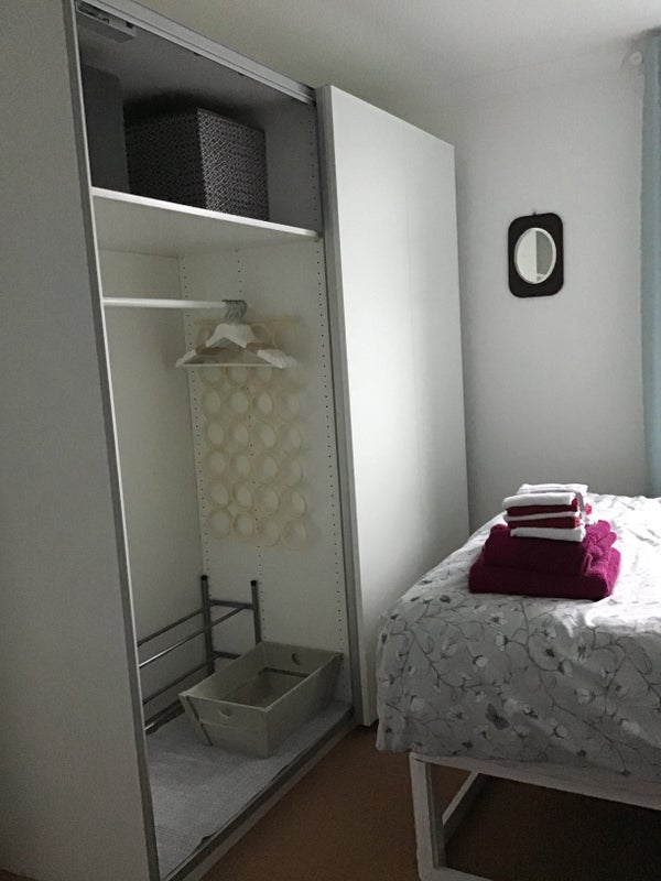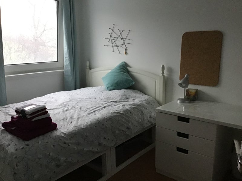 Furnished room with single bed, large wardrobe, desk, lamp, chair and bookshelf. Spare bed can be supplied for occasional overnight guests.