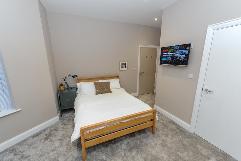 Fully furnished modern ensuite room including double bed, smart TV, clothing rail and chest of drawers (desk can be provided).