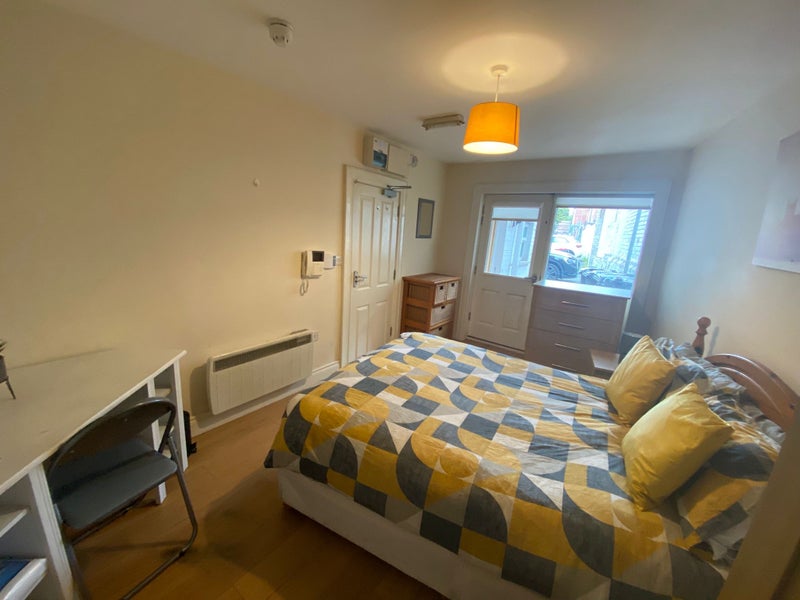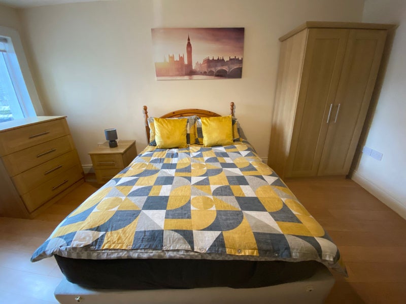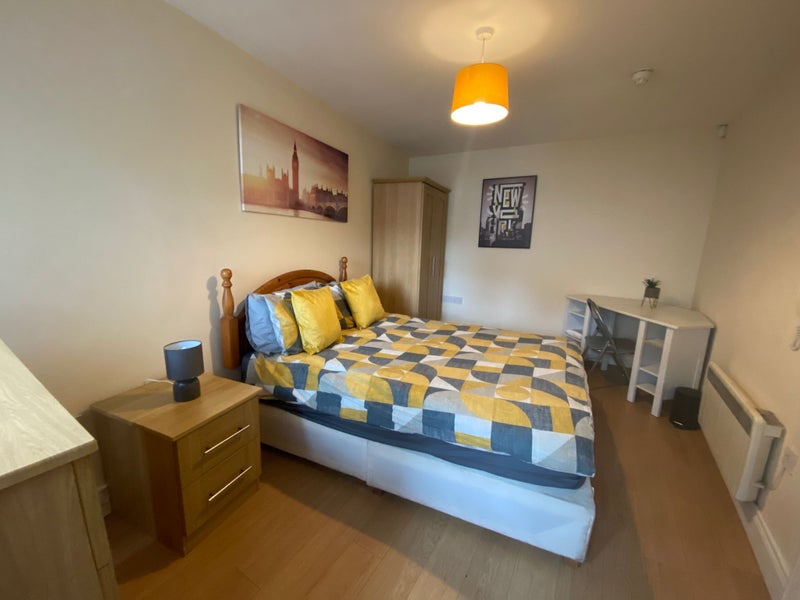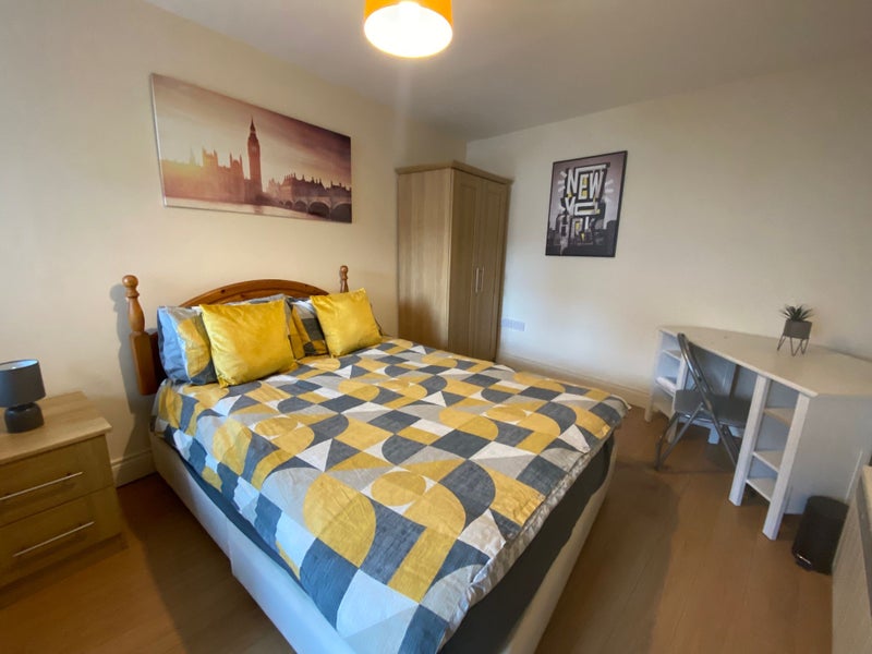 This generously sized room is offered fully furnished, providing a comfortable and ready-to-occupy living space. It includes a double bed with mattress, a spacious double wardrobe, a chest of drawers, a bedside cabinet, a desk, and chair.