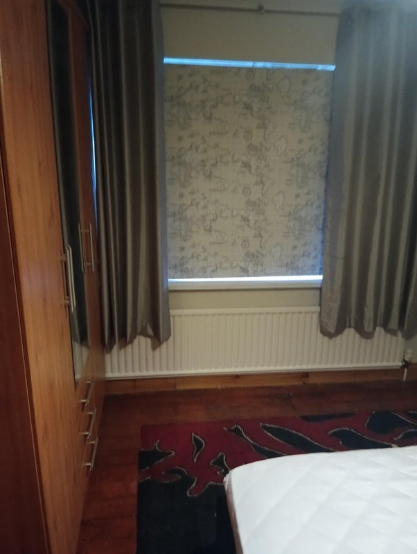 The room is painted in neutral tone with wooden floor, rug, leather bed, mattress 1yr old, large wardrobe, drawers, blackout blinds and curtains.