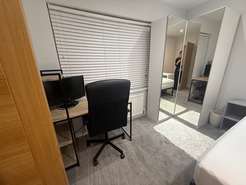 The room itself is furnished with a double bed, under-bed storage, a mirrored wardrobe, a small shelf unit, a desk and desk chair.