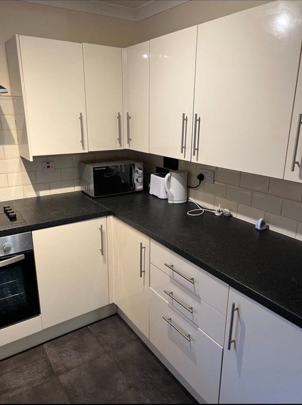 Boasts a spacious dining area with a massive table, oven, complemented by a large American fridge-freezer, washing machine, microwave, kettle, toaster, and other essential amenities.