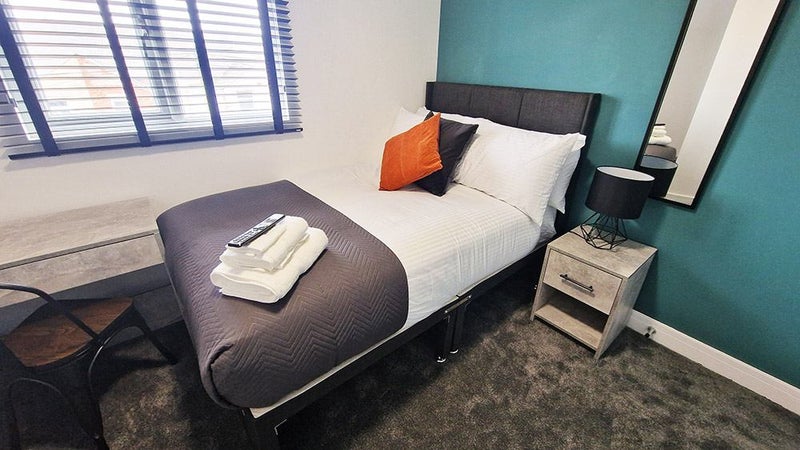 Large double room on the first floor with an en-suite shower room, wardrobe with drawers, bedside table with a lamp, desk and chair, wall-mounted Smart TV and a large window facing the front of the property.
