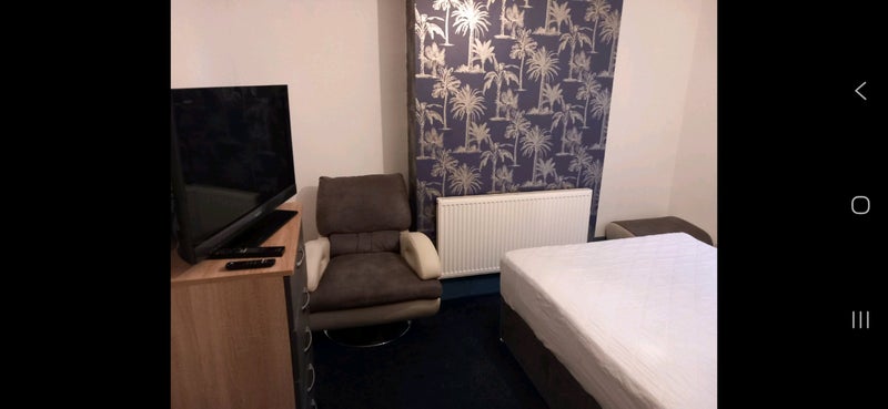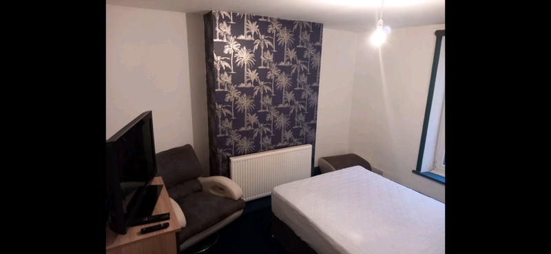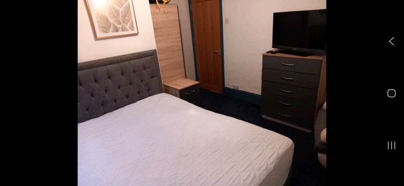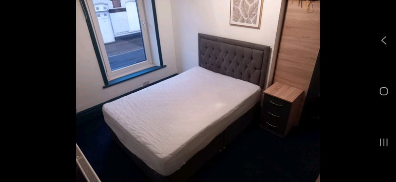 The room is south facing with a big window and blackout blinds, new bed with comfortable pocket spring mattress with storage, bedside table, chest of drawers and wardrobe with a mirror.