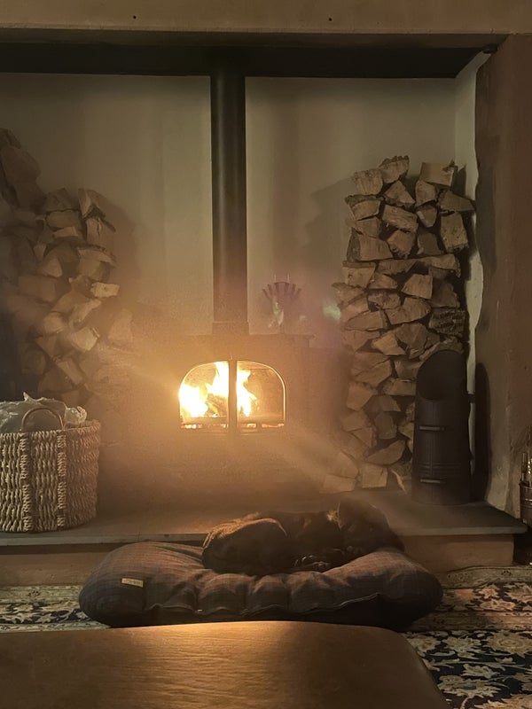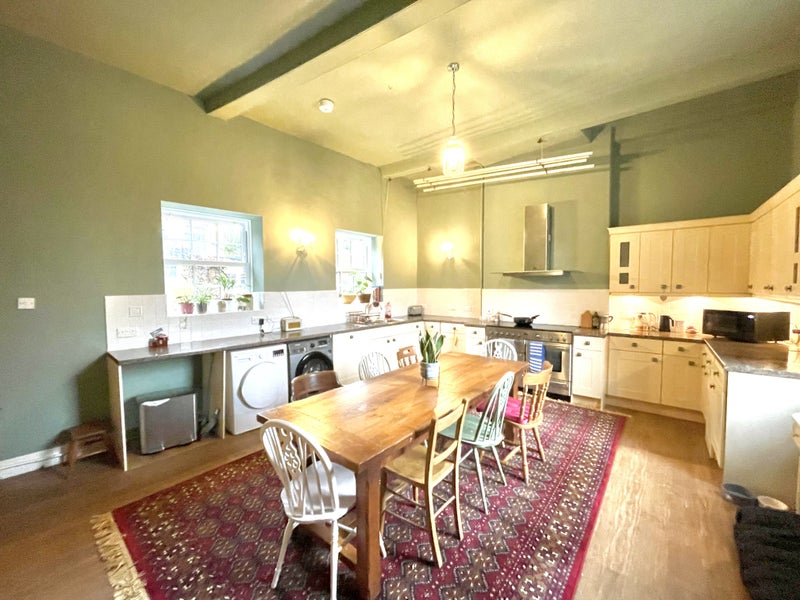Large shared kitchen and living room downstairs with wood burning stove.
