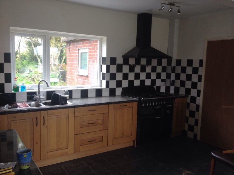 A large kitchen diner, Oak units complete with fitted dishwasher and microwave, large Rangemaster cooker, large fridge and large freezer, dining table and chairs and larder.