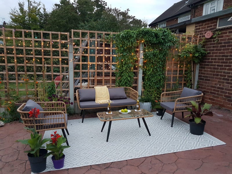 Large south facing rear garden with large patio and outside sofa, 2 chairs and table, large lawn with several flower beds.
