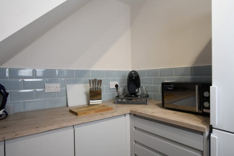 The kitchen is well-appointed with a dining table, pendant light, microwave, kettle, toaster, Dolce Gusto coffee machine, oven, gas hob, cups, glasses, tableware, cutlery, utensils, tea towels, and oven gloves.