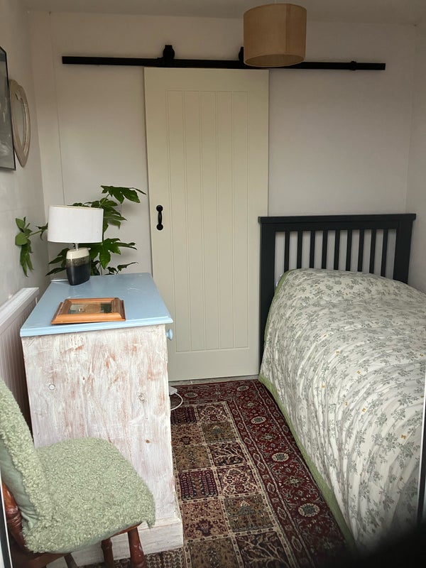 Small but attractive room, discrete entrance. French windows on to patio. New en-suite shower room. Microwave to be agreed. Single bed,. Use of kitchen in main house. Washing machine available. Electric radiator and shower. I, come and go during the day. Sociable and helpful. working actress and support worker. Respects privacy and need for solitude. . Best match for mature person(Age not an issue) Dependable, spiritual and compassionate. References please.