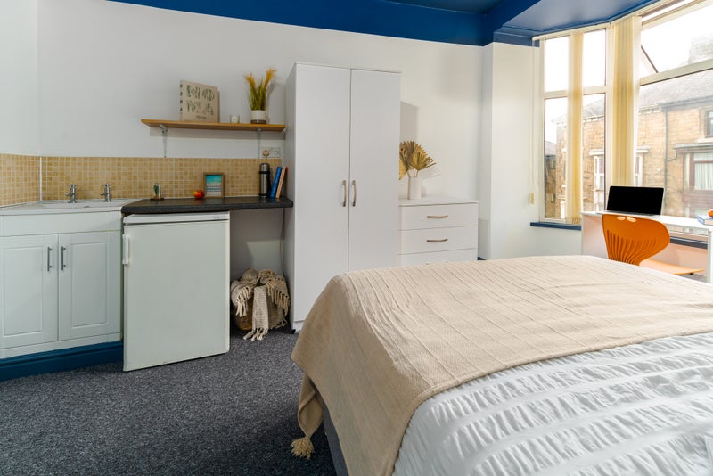 A bright, stylish space with a double bed, wardrobe, desk, and bedside table - everything you need to move straight in.