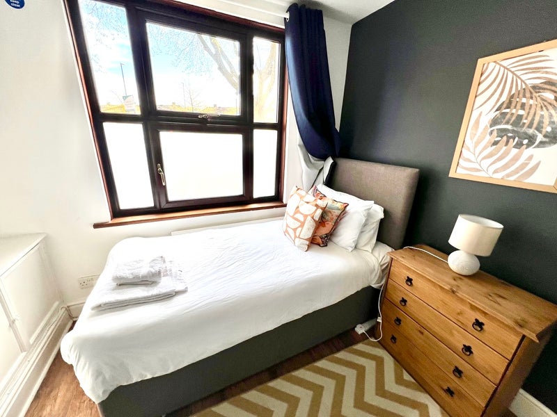 The room is furnished to include a bed, bedside table & lamp, chest of drawers and single wardrobe.