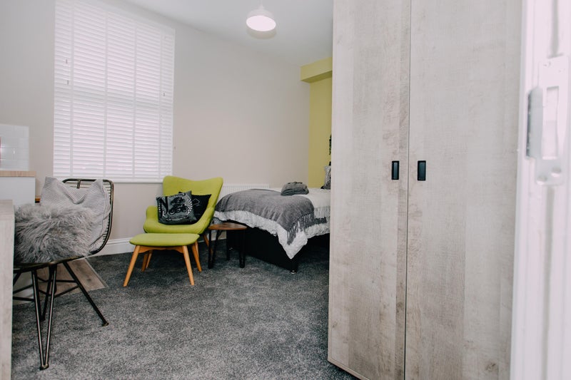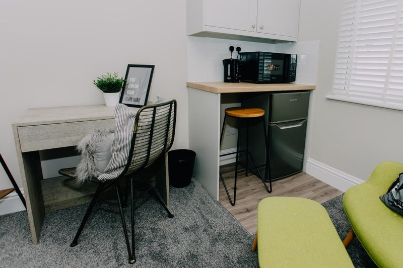 TOP QUALITY - fully furnished with comfy bed, wardrobe, drawers, bedside cabinet, armchair/sofa, desk/chair. Kitchenette with microwave, kettle, fridge/freezer, breakfast bar. En-suite with shower/basin/loo/heated towel rail.