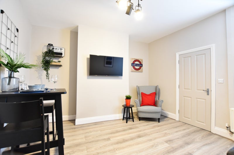 - Spacious living room with dining table, comfy sofas + TV for movie nights