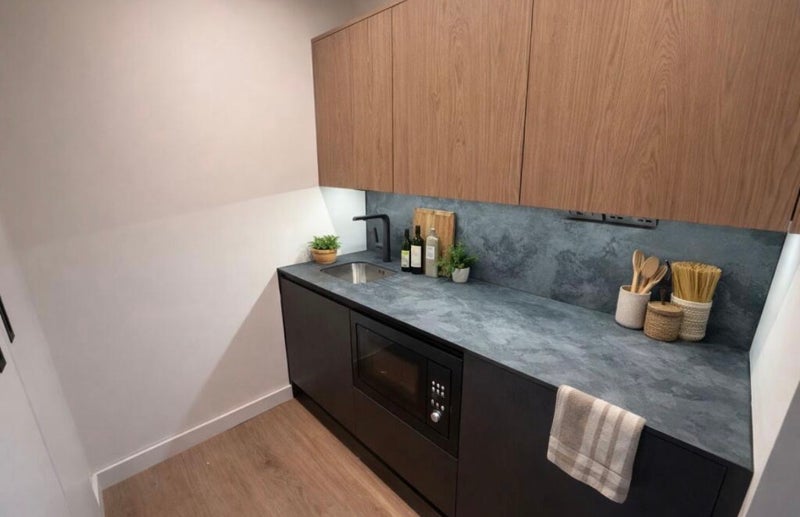 Open-plan living space with sleek, fully equipped kitchenettes