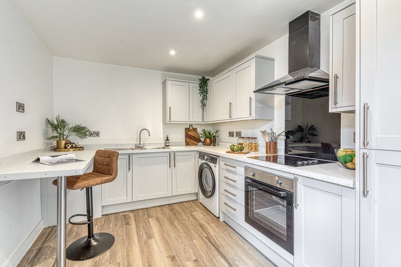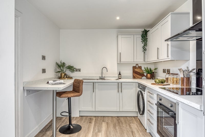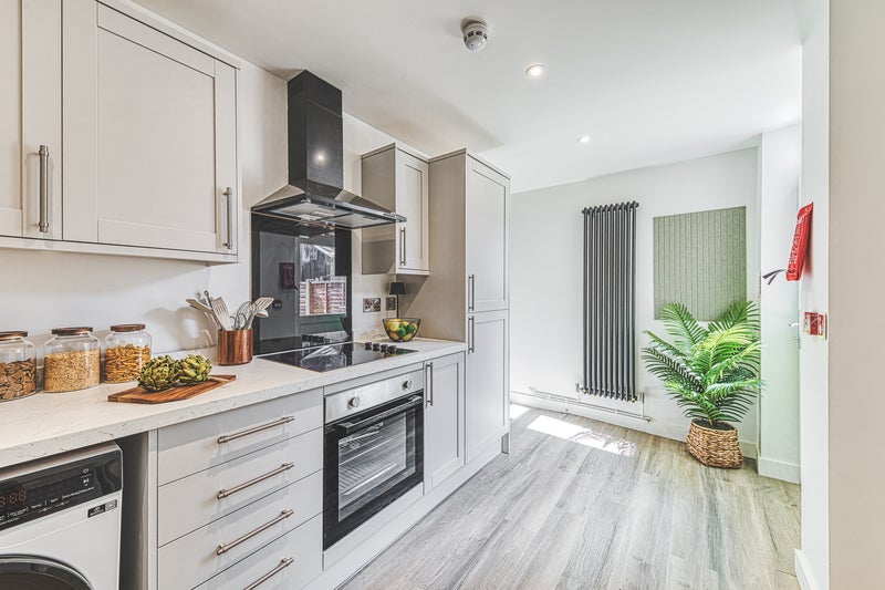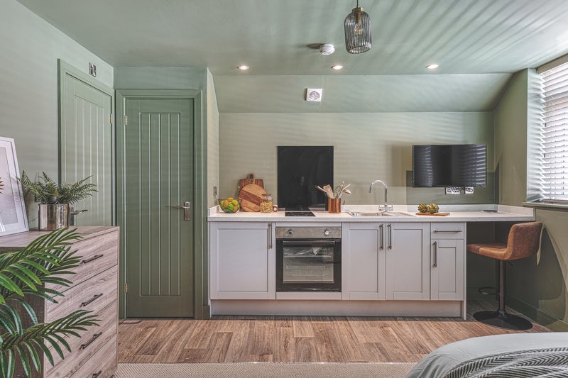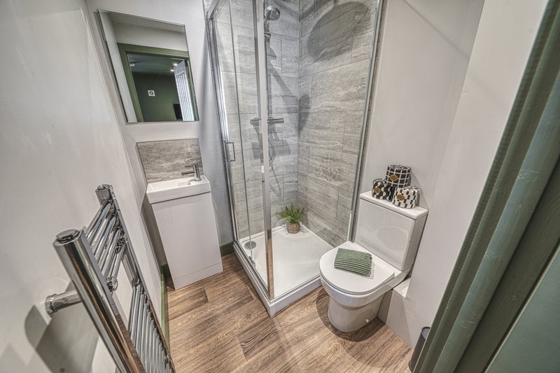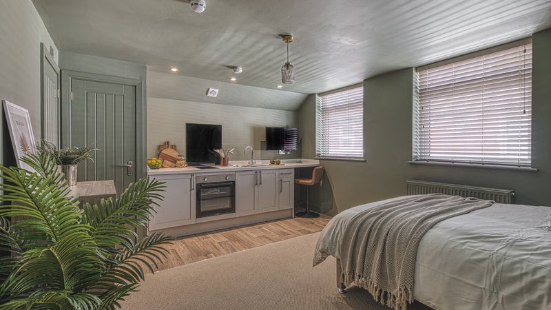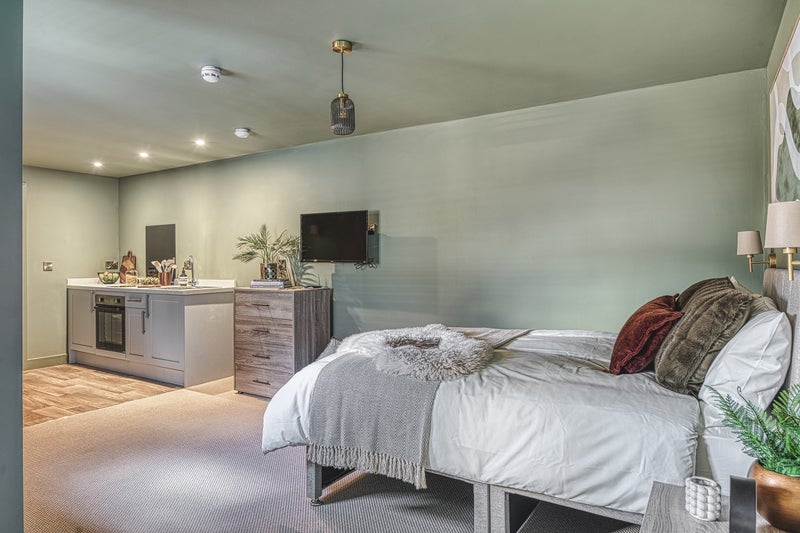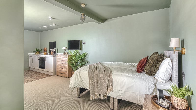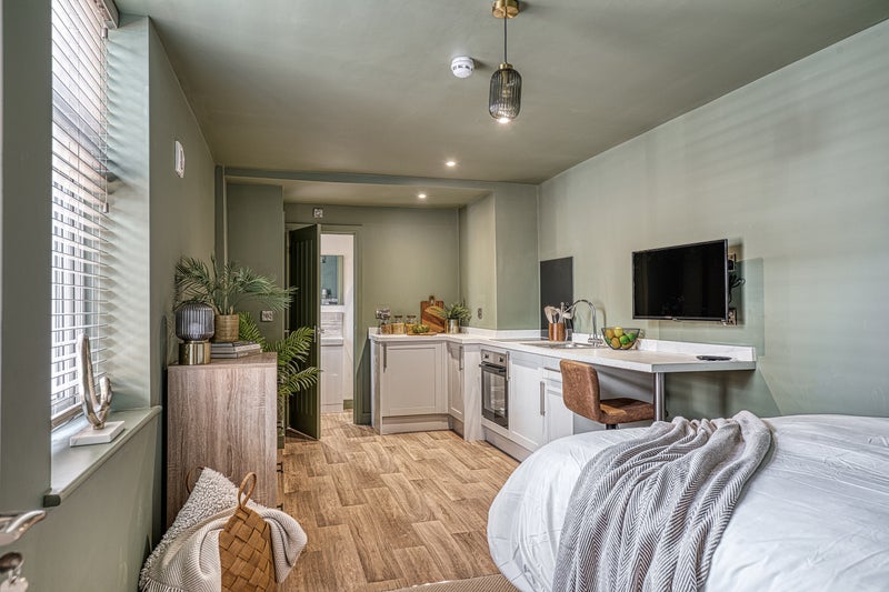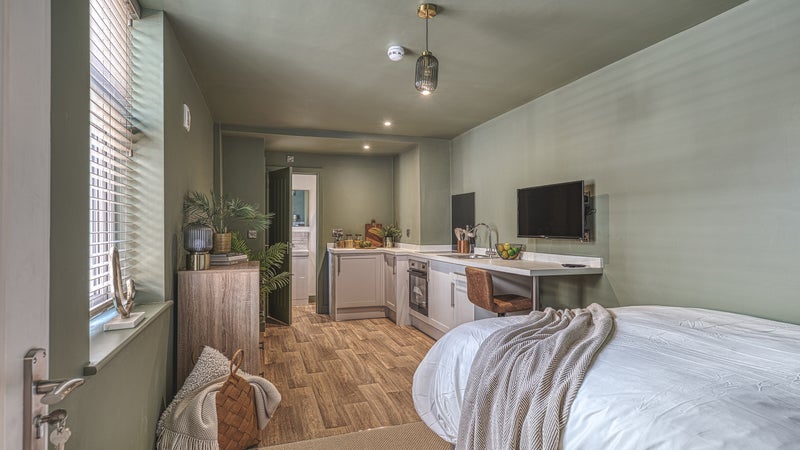 Every studio comes fully furnished and features a modern kitchenette fitted with a hob, fridge-freezer and ample storage space. You’ll also benefit from a cosy bed, wardrobe, bedside tables, and a TV, making it ready for immediate, self-contained living.