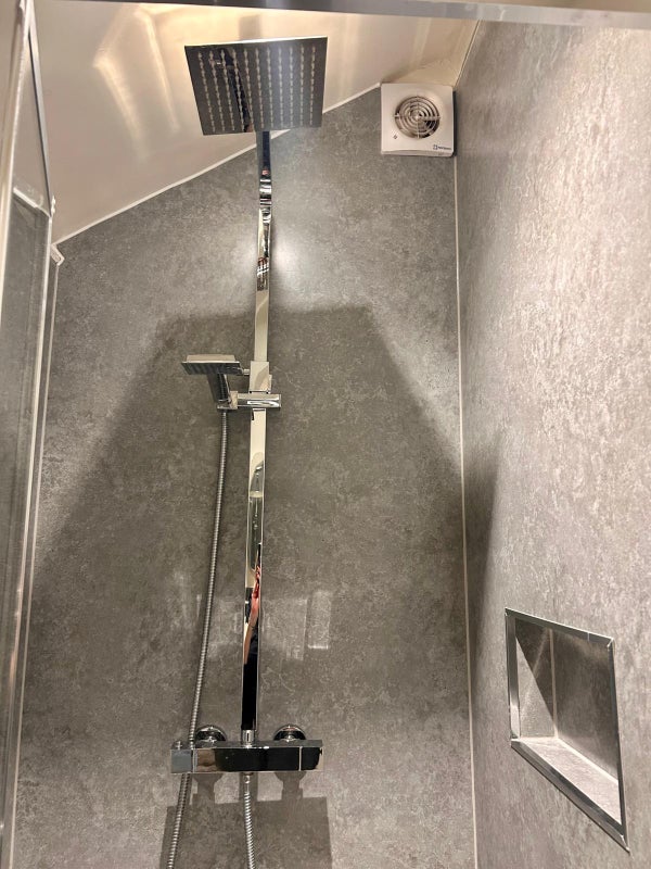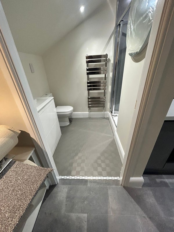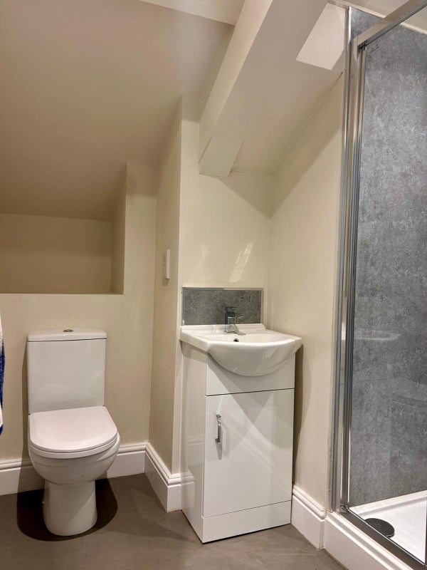 The en-suite has a vanity unit with sink, toilet and shower cubicle with rainfall shower and hand held shower too.
