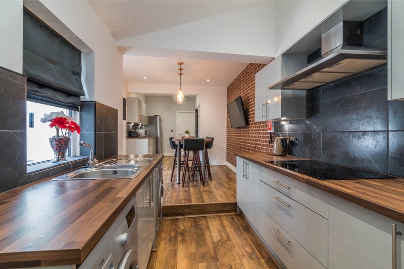 Brand new HUGE kitchen with island and 50 INCH HD TV!! contains all appliances including a large American fridge freezer, microwave, kettle, toaster, kitchen utensils, washing machine and tumble dryer. There is also a private rear garden perfect to chill out in the summer months. also included is the FASTEST broadband available!