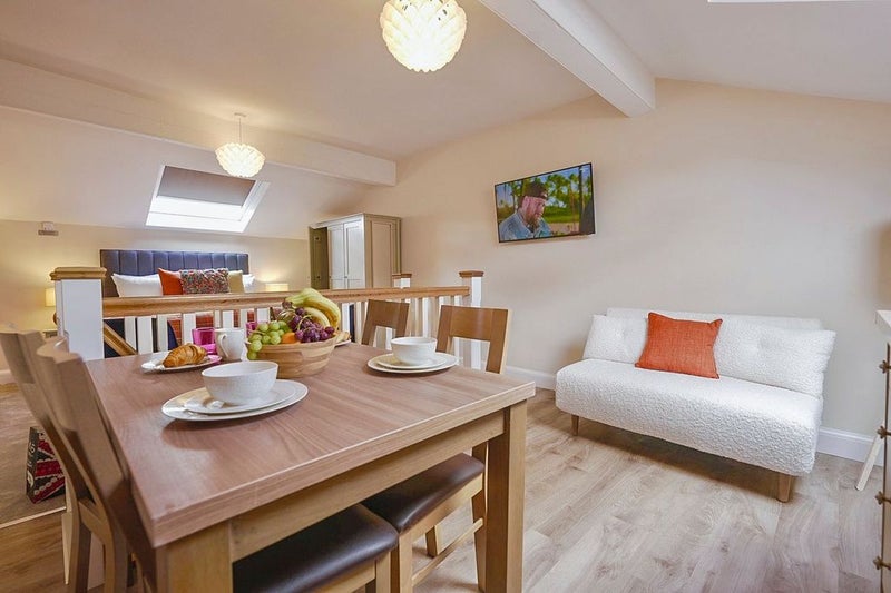 🌟Elegant lounge/diner with large flat Smart TV, comfortable sofa and bench seating for social eating.