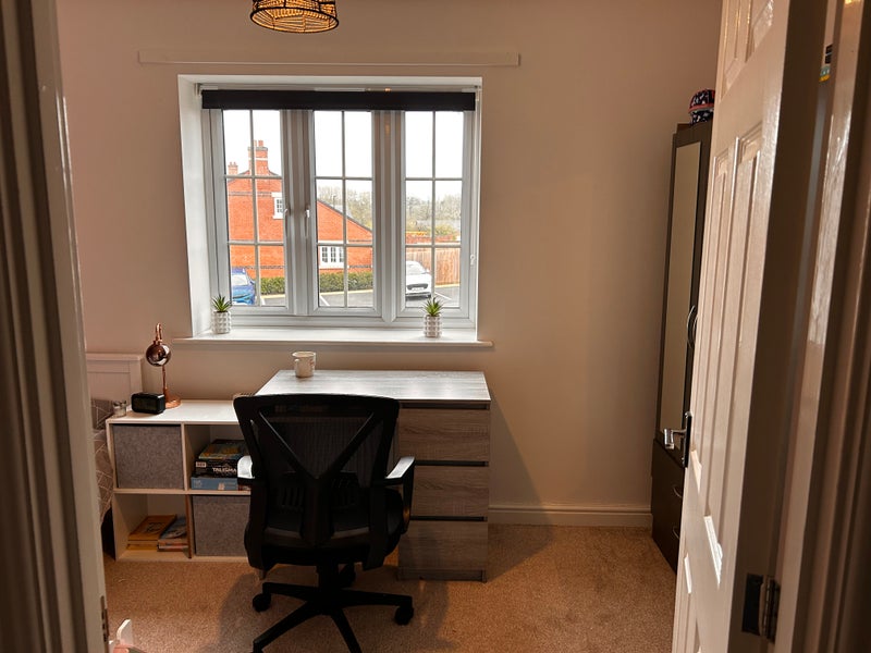 A comfortable, furnished private room is available now in a new building. This is a peaceful space perfect for someone who works from home or values a calm environment.