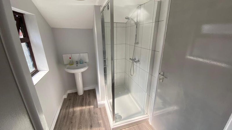 Modern communal shower room with large walk in shower cubicle, w/c and handwash basin.