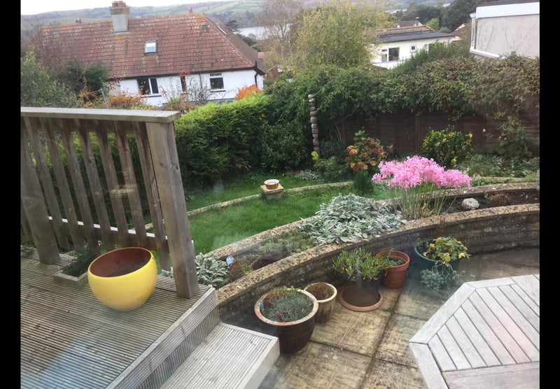 Sunny garden with terrace and summerhouse, in a glorious position overlooking the Teign.