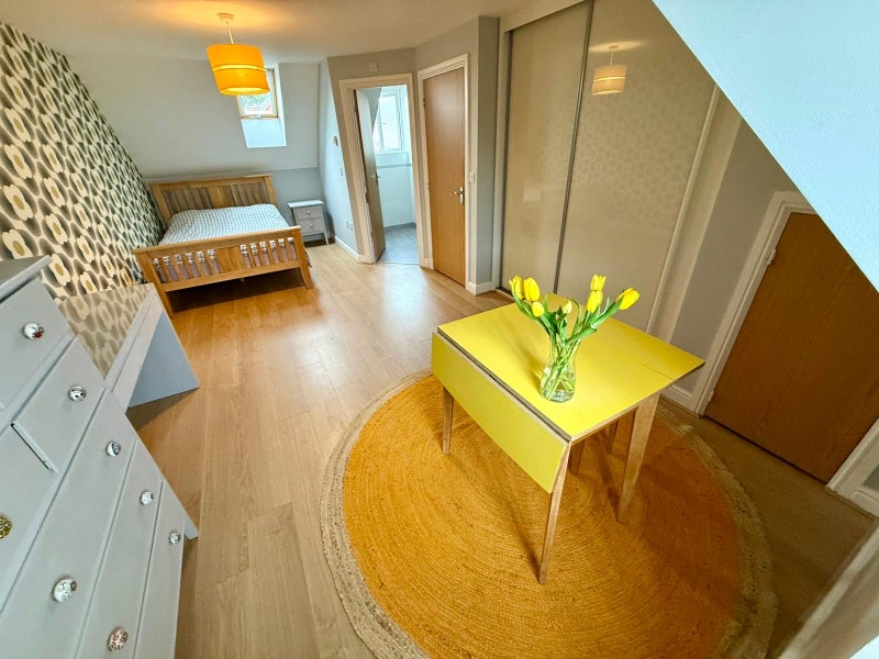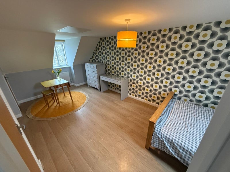 Large double room on top floor of house. En-suite. Mini fridge, microwave and kettle in room. Access to garden. Parking on side road. WiFi.
