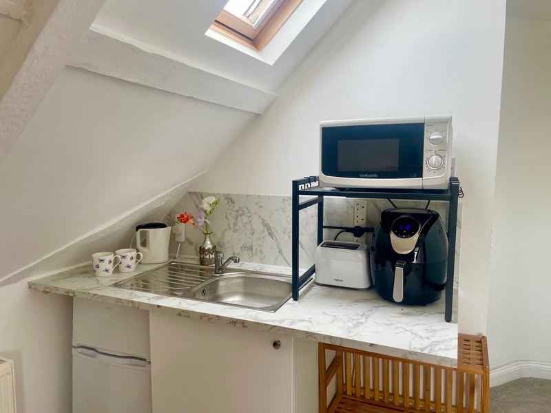 The annex is on the top floor and is entirely self-contained, giving you your own private double bedroom, living area, kitchenette including hob, air-fryer, microwave, kettle, toaster plus crockery & utensils) and shower room. It’s perfect if you like having your own space without sharing day-to-day facilities.