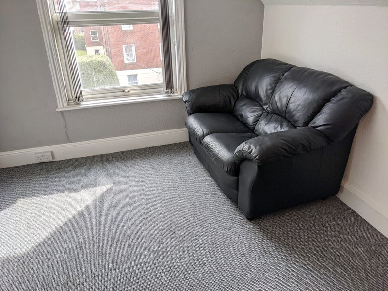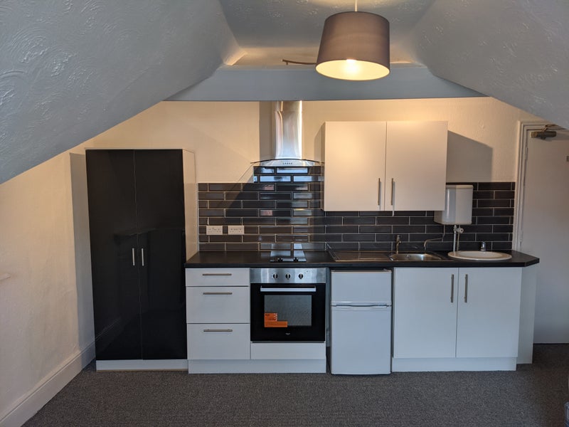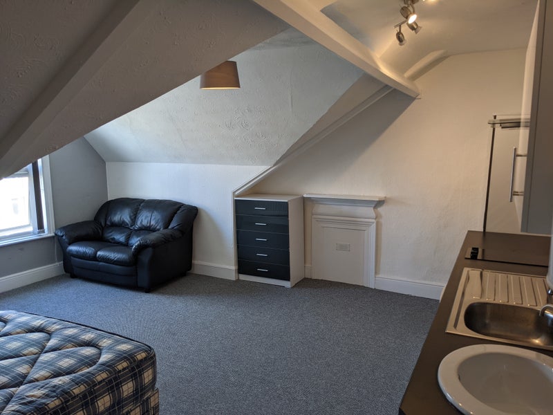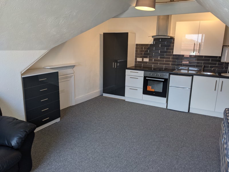 The bedsit consists of a kitchen with full size oven, 2 burner electric hob, fridge freezer and a sink. There is a bed provided, a wardrobe, chest of drawers, bedside table and a 2 seater leather sofa.