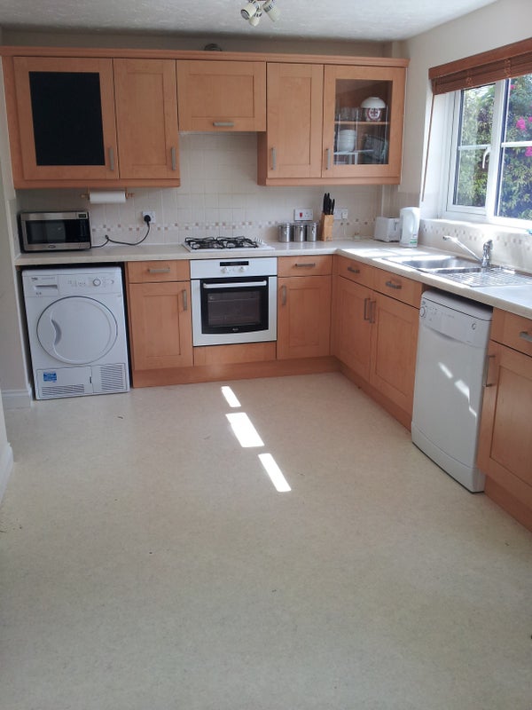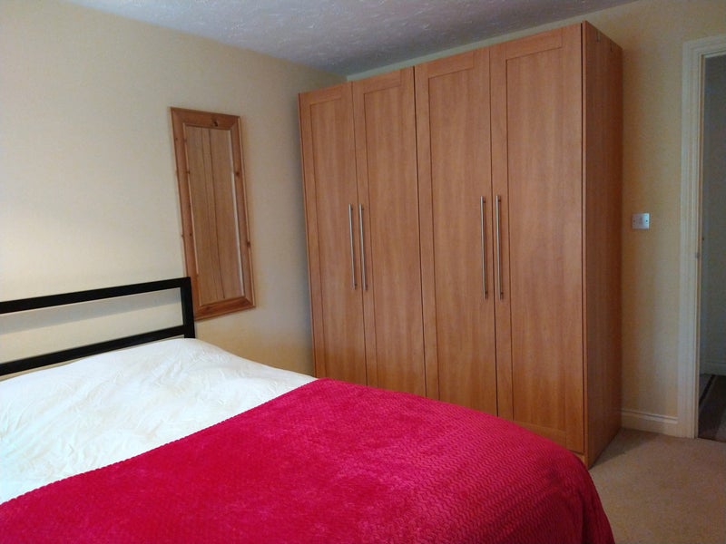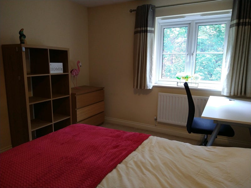 The available room is a generous double overlooking trees and a cycle path. It has a large wardrobe, drawers, desk, shelf unit, chair, etc. The rest of the house has great communal space, parking, garden and garage. Really nice housemates and super convenient location.