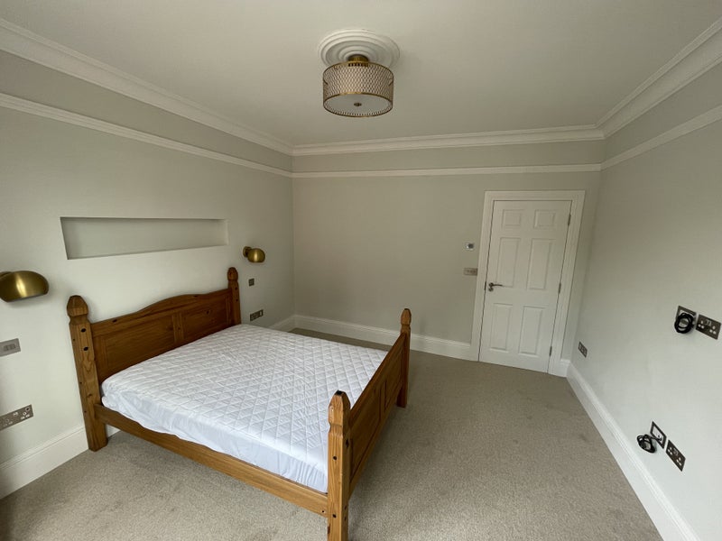 Large first floor double bedroom 4.4m x 3.7m. Large bay window provides lots of natural light. LED recessed Book Shelf, Wall mounted reading lights. Double bed with brand new mattress.. Options for bedside tables and wardrobe.