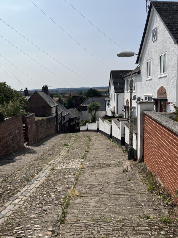 The road is a lovely cobbled pedestrian only road in the middle of Exeter town.