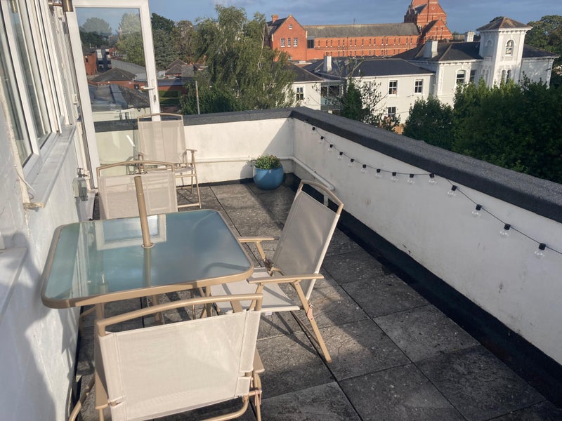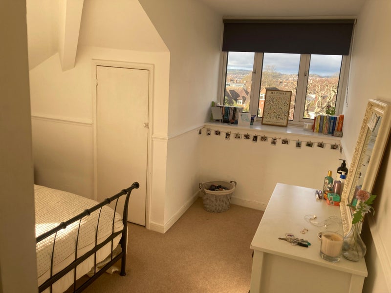 The room is light and sunny, with direct access to the balcony, and views of Exeter and the surrounding countryside. It comes furnished with a comfortable double bed, two bedside tables, a wardrobe with full length mirror and shelving, a chest of drawers, and a large storage cupboard under the eaves.