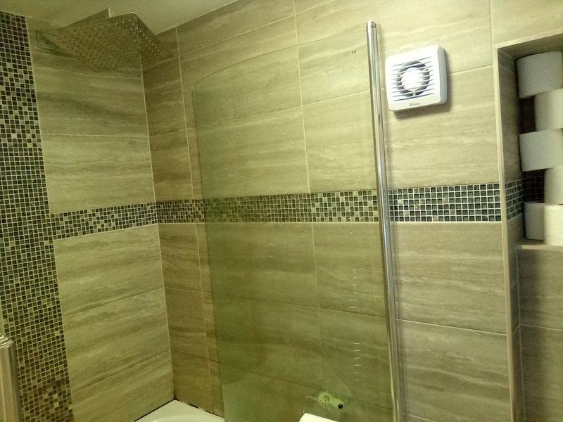 • Modern bathroom with rainfall shower and bathtub