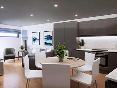 Fully equipped kitchen with hob, oven, and fridge/freezer
