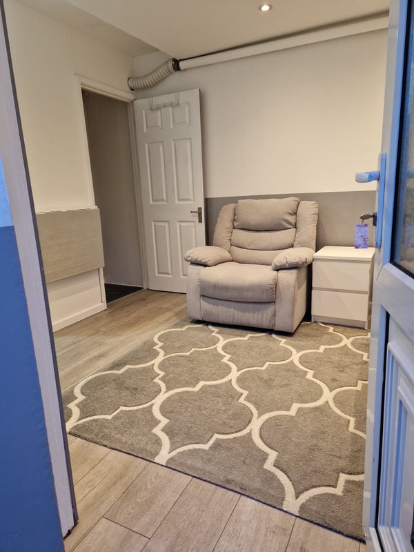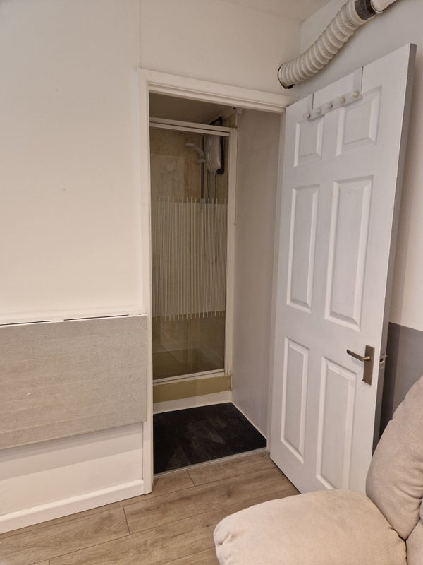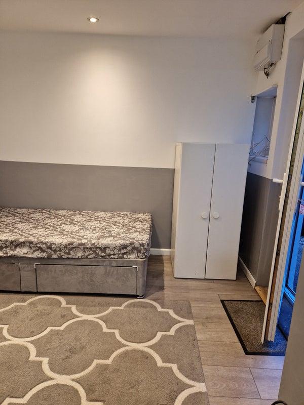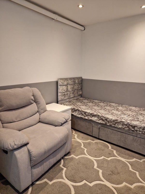 Self contained studio flat for a single occupant. Includes single bed with under draw storage wardrobe bedside cabinet reclining chair. Has a kitchen area includes cooker fridge freezer etc. Separate small bathroom with shower Toilet and sink. Sorry no pets & non smoker only