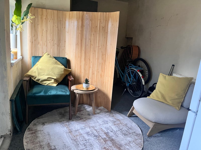 COMMUNAL SPACES: Shared galley kitchen between 4 people with breakfast bar seating, gas hob and oven, air fryer, microwave, toaster, kettle, washing machine, tumble dryer, plenty of cupboard space, plenty of chilled and frozen storage. A shared living space in the garden room also provides further communal seating, some storage for bikes/surfboards etc. Small shared courtyard outside area.
