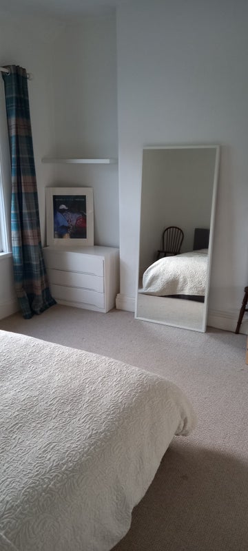 Large double room with double bed and 2 sets of drawers and hanging space. The property is 2 bed, lounge, dining room, bathroom, kitchen, decked garden area which gets the sun all day. The area is quiet, bus stop just down the road. Mutley Plain is 5 minutes drive. Food isn't included in rent but an agreement can be made if its easier. The house is there to be used as your own with respect. I have a cat. Looking for a sociable professional.