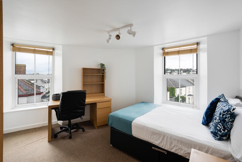 This flat is comprised of six large study bedrooms – each with an ensuite shower room. The bedrooms have light oak double beds, bedside chests, desks chest of drawers, double wardrobes and executive style chairs.