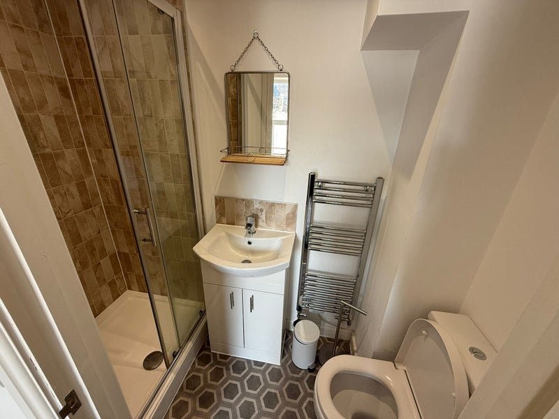 Bathroom has shower, WC and basin.
