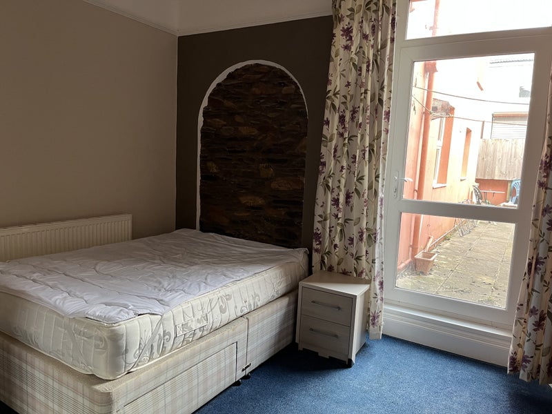A ground floor room with access to courtyard, with double bed, bedside unit, chest of drawers and wardrobe. .