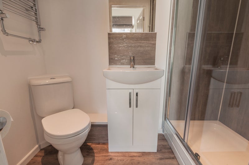 Room 5 - £575pcm - double room with en-suite. This well-designed, top-floor room comes with a double bed, bedside drawers, chest of drawers, wardrobe, and home-working desk if needed. The en-suite has a power shower, vanity unit, heated towel rail and handy hooks for towels.