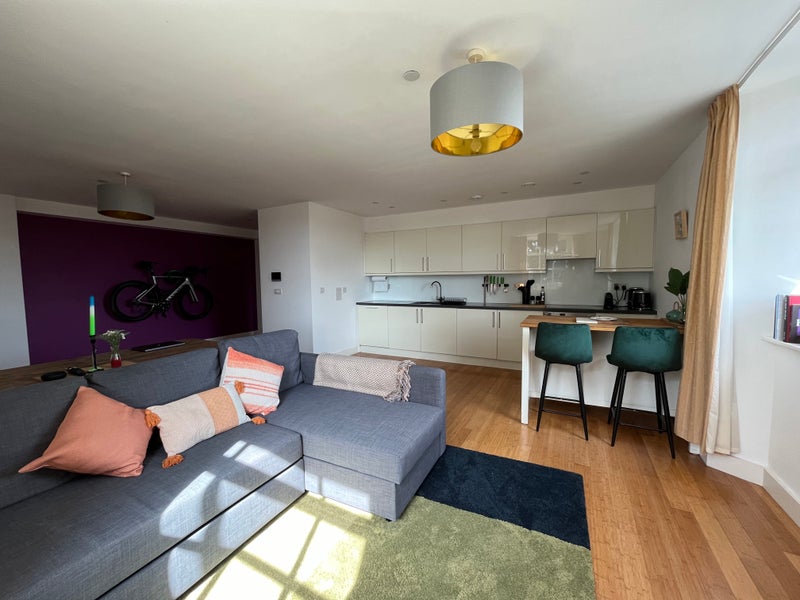 There is a light and airy, spacious double room with built in wardrobes for your use. The main living are and kitchen includes a television, washing machine, tumble dryer, utensils, internet and great views of the city.