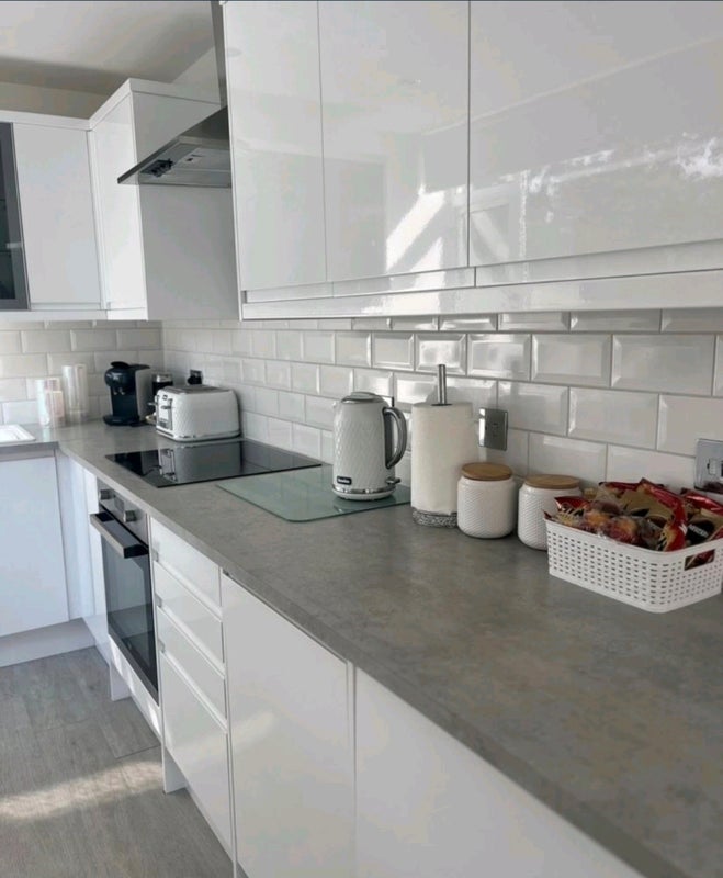 Modern Kitchen: Sleek, high-gloss white units equipped with an oven, hob, washer/dryer, dishwasher, and microwave. Large windows provide plenty of natural light.