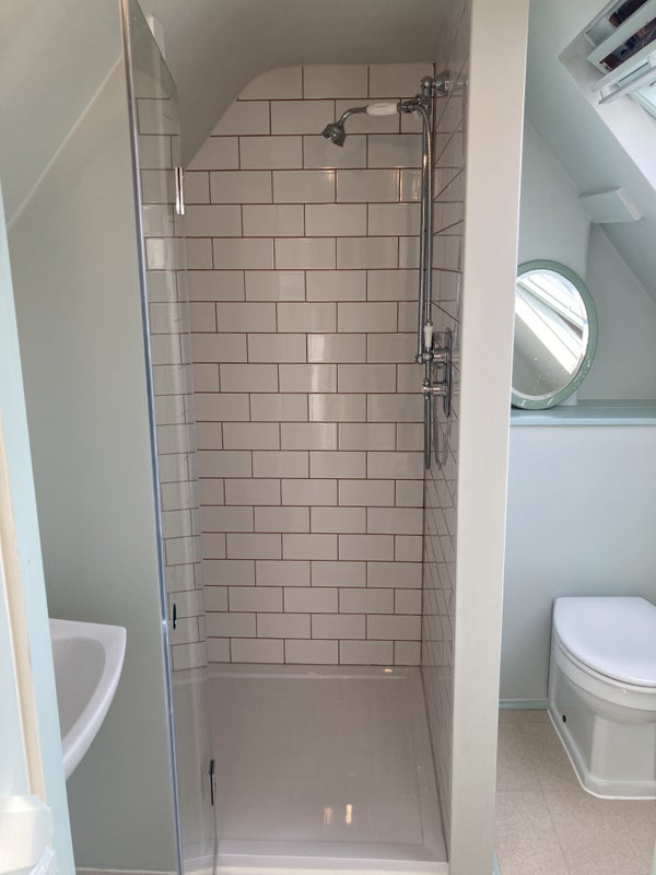 A one bedroom, self-contained attic space with its own access through a courtyard garden up a spiral staircase. The attic space has its own living area, kitchen area and desk area (that are all private).. Lovely light, great views, with double bedroom, open plan kitchen and living room space (two separate areas), shower room and entrance hallway. The flat has recently been redecorated and had a new bathroom and kitchen area put in. There is a double bedroom (with double bed, draws and wardrobe), and a living room area with a sofa/sofabed. There is a kitchen area with cooker, fridge, sink and cupboard space. There is a shower room with shower, toilet and sink. The living space is L shaped and there is an area for a desk.. At the top of the outside staircase there is a small space, just big enough for a few plants and pots, and just enough space to put a chair on and sit outside. Please note the access is through a courtyard down a flight of stairs and it has its own separate front door up a spiral flight of stairs and there are stairs in the flat. Please also note there is no washing machine but there is a launderette a five minutes walk away.