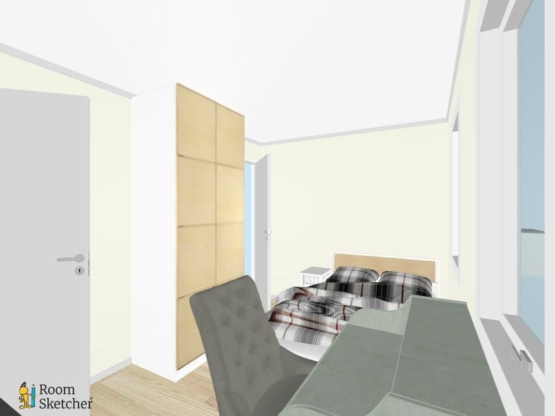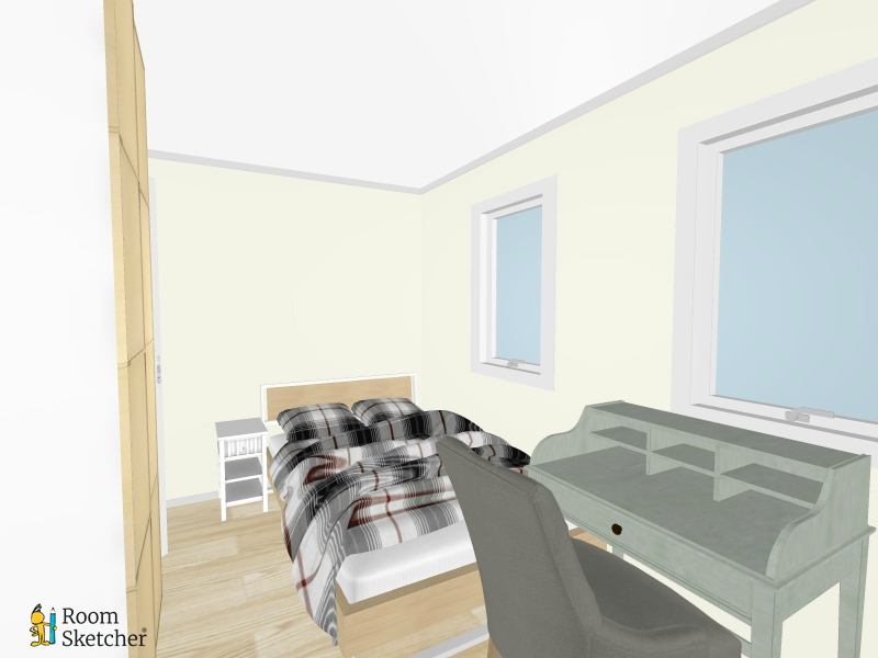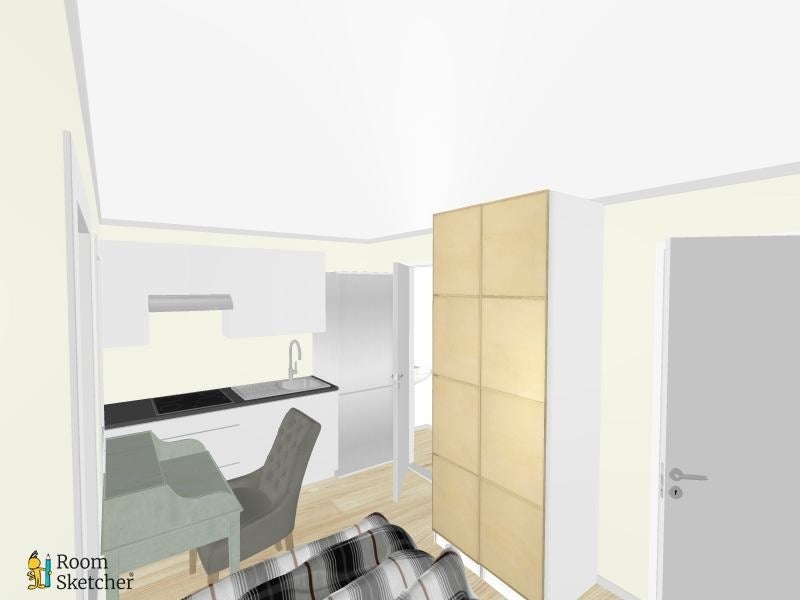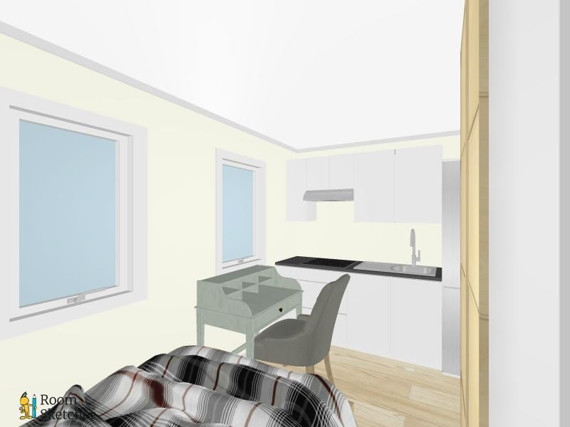 The studio can fit a double bed (& wardrobe) on one side with its own kitchenette on the other - including storage cabinets, 4 point electric hob/stove, full oven, sink & full-height, integrated fridge-freezer.