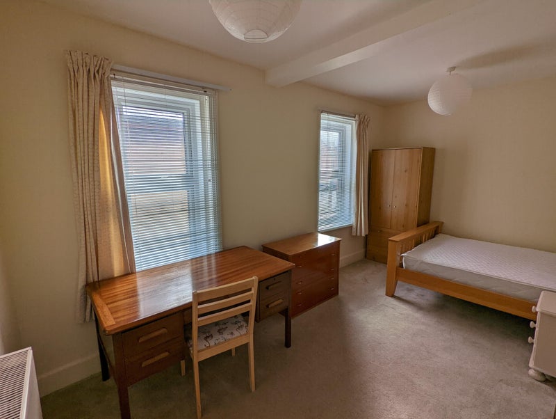 A spacious double room at the back of the house, with two windows that bring in lovely mid‑morning sun. It’s quiet, away from the road and railway noise (you may feel the odd fast train, but I barely notice them now).